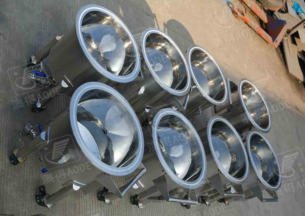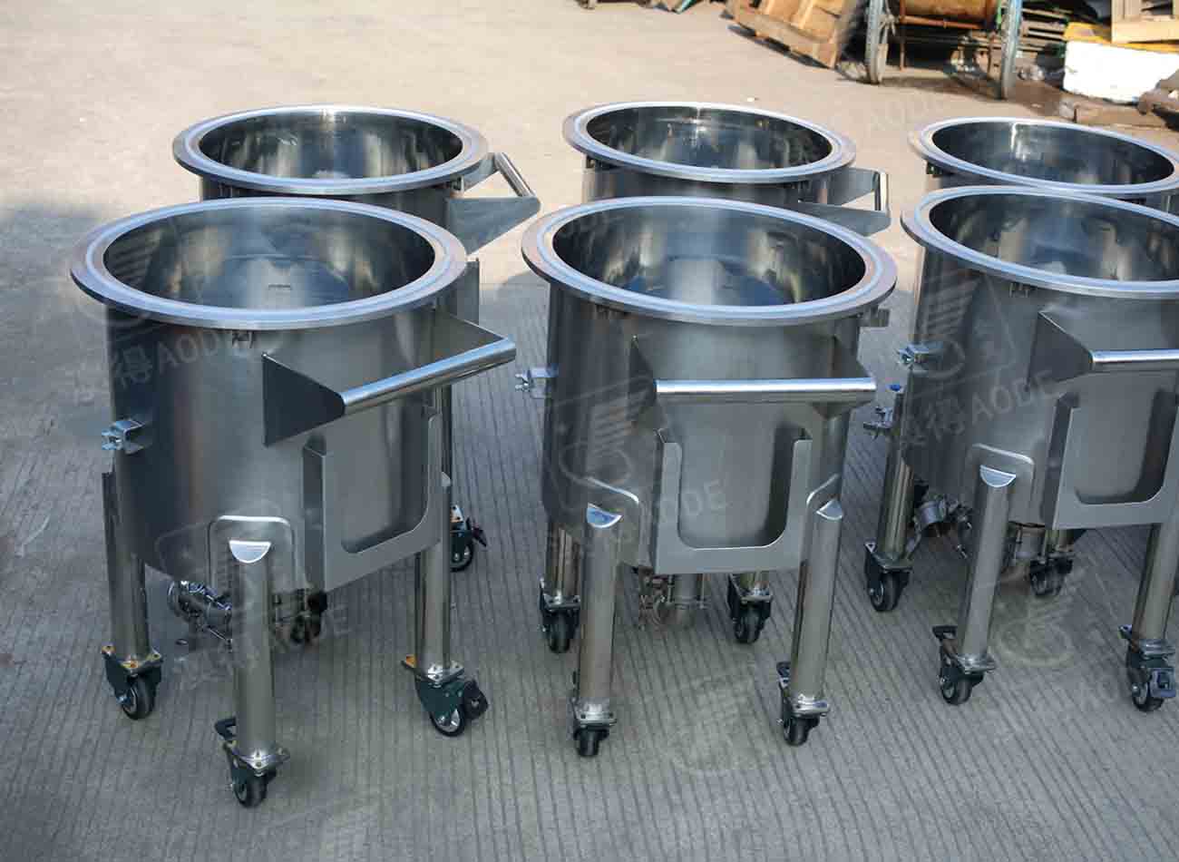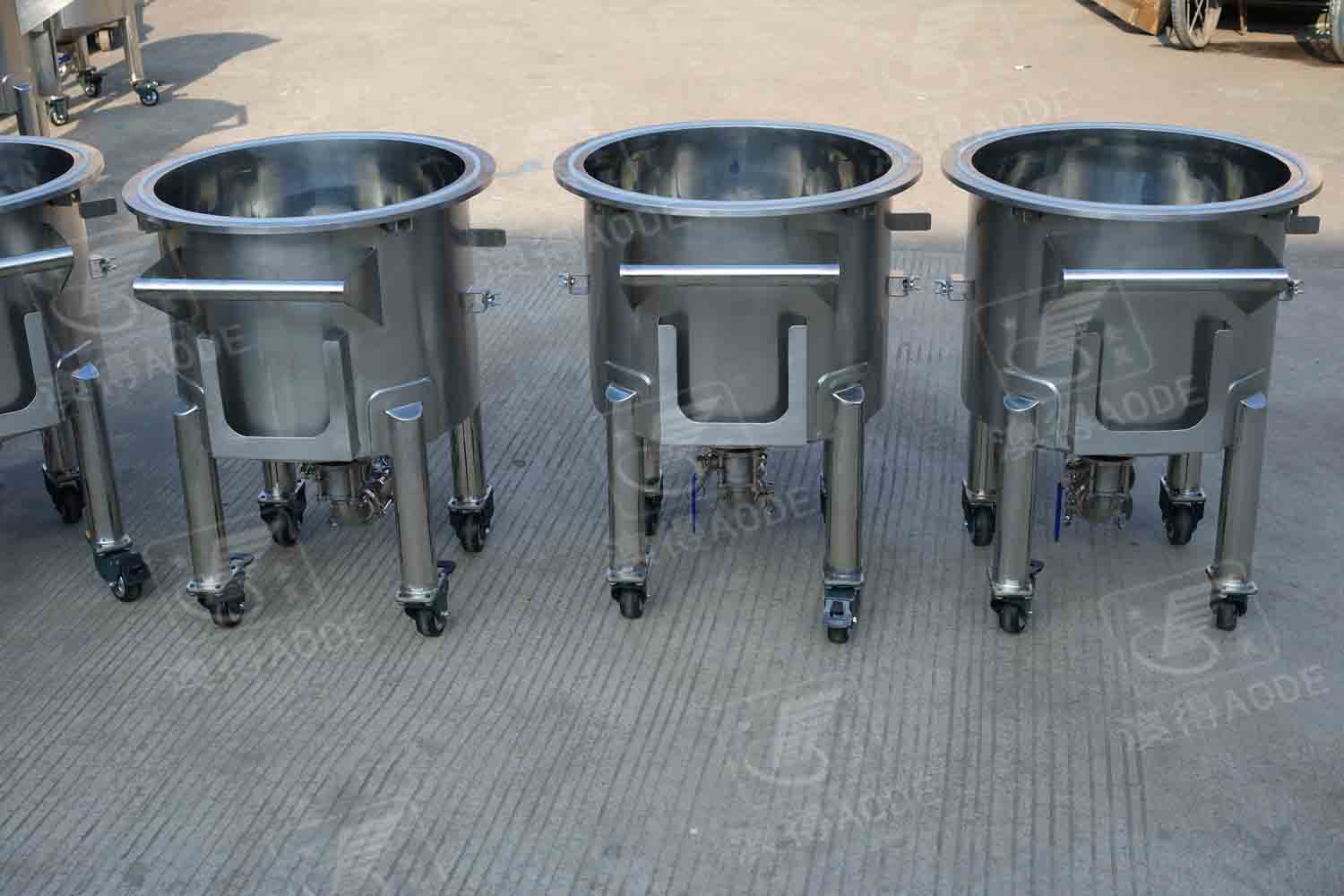 配放料閥,缸底可定制為平底傾斜出料,或圓底錐底中心出料,下有移動輪,帶自剎車裝置。